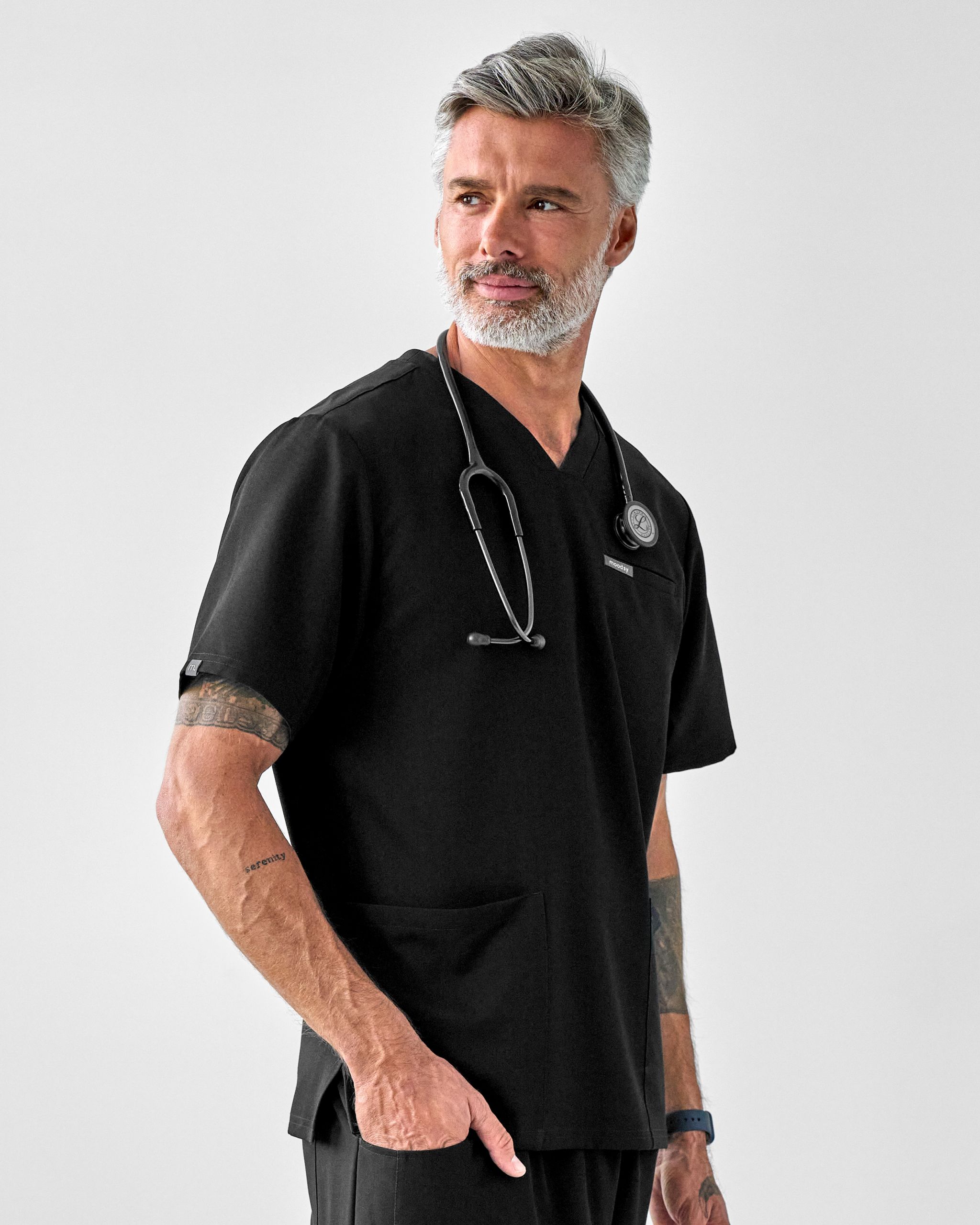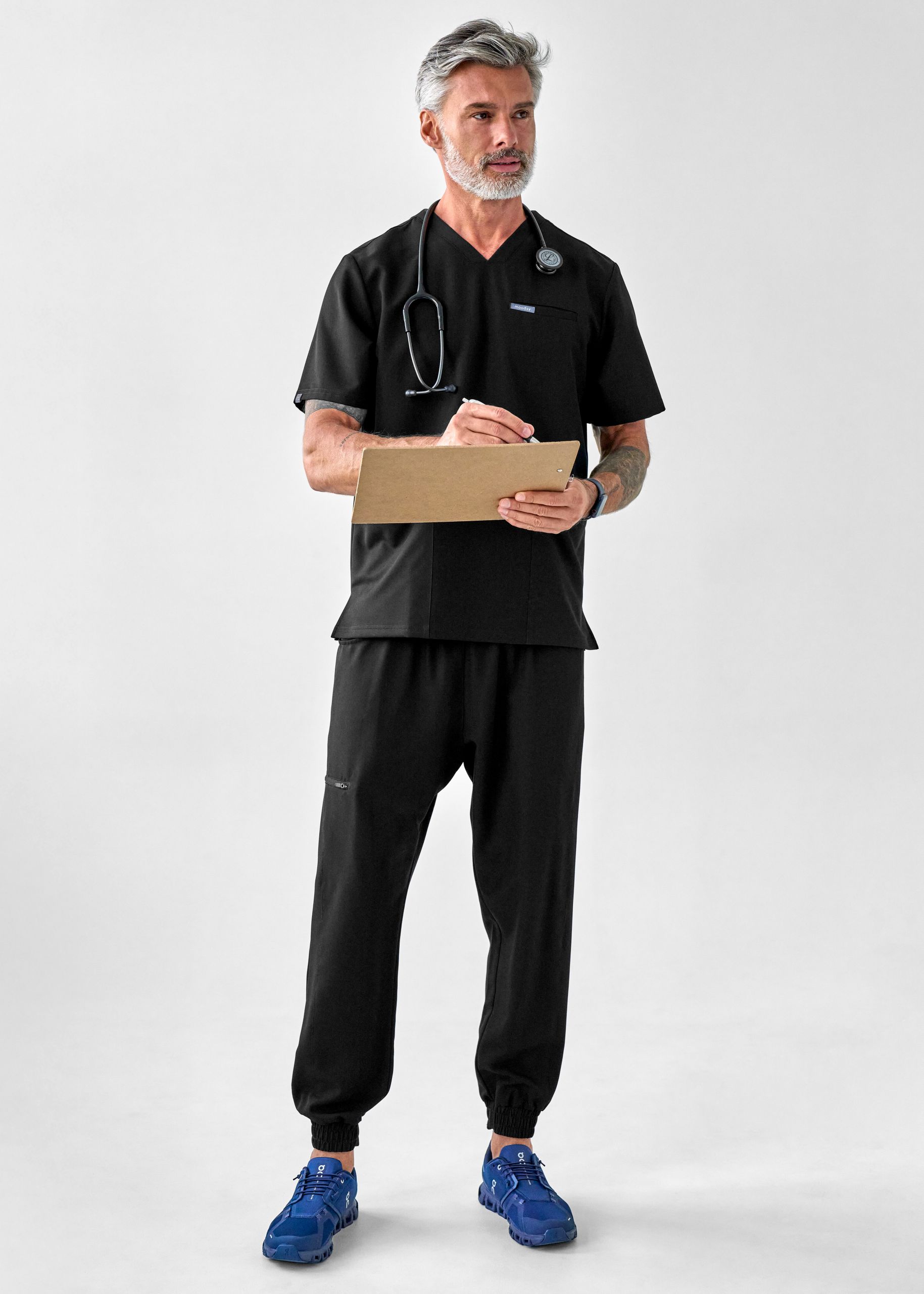 Black to najbardziej klasyczny z kolorów. Kolor czarny – uniwersalny, elegancki i niezawodny. Maskuje zabrudzenia, dobrze wygląda na każdej sylwetce i zawsze wpisuje się w profesjonalny dress code. To wybór dla tych, którzy stawiają na prostotę, która się sprawdza – niezależnie od tego, co przyniesie dzień. Sporty Black to bluza stworzona we współpracy z lekarzami z oddziałów szpitalnych. Fason inspirowany odzieżą sportową, z elastycznym pasem i sznurkiem do regulacji, łączy wygodę z estetyką. Model został zaprojektowany z myślą o mężczyznach pracujących w zawodach medycznych, którzy potrzebują praktycznego stroju, który nadąża za ich tempem. Tworzy komplet medyczny wraz ze spodniami sporty lub cozy – odzież medyczna, która wygląda dobrze i działa jeszcze lepiej.Bluza ma trzy ergonomicznie rozmieszczone kieszenie: jedną na piersi – idealną na długopis lub notatki – i dwie głębokie kieszenie po bokach. Dzięki technologicznej tkaninie Moodsy Air bluza nie gniecie się, dopasowuje się do ruchu i nie traci kształtu nawet po wielu praniach.