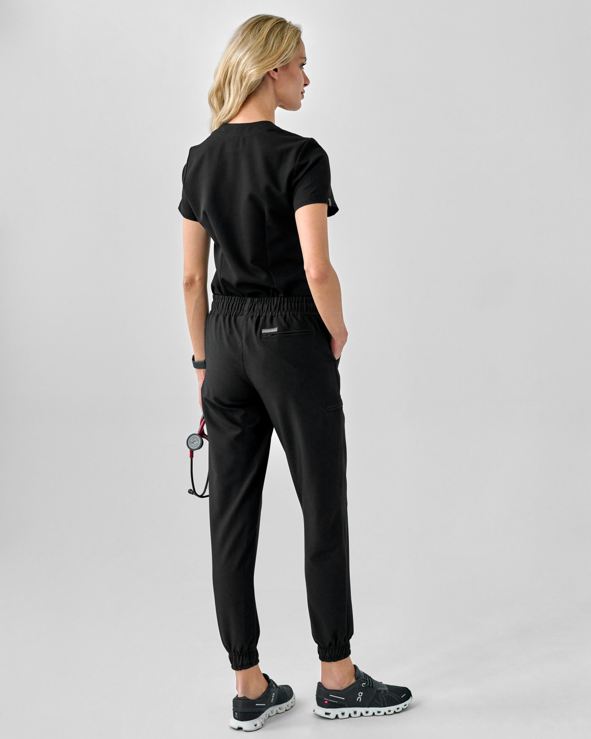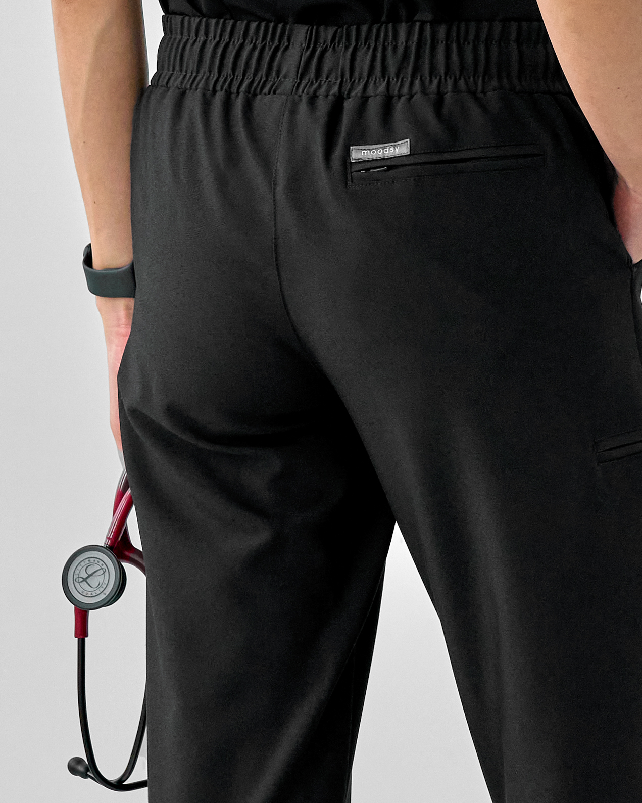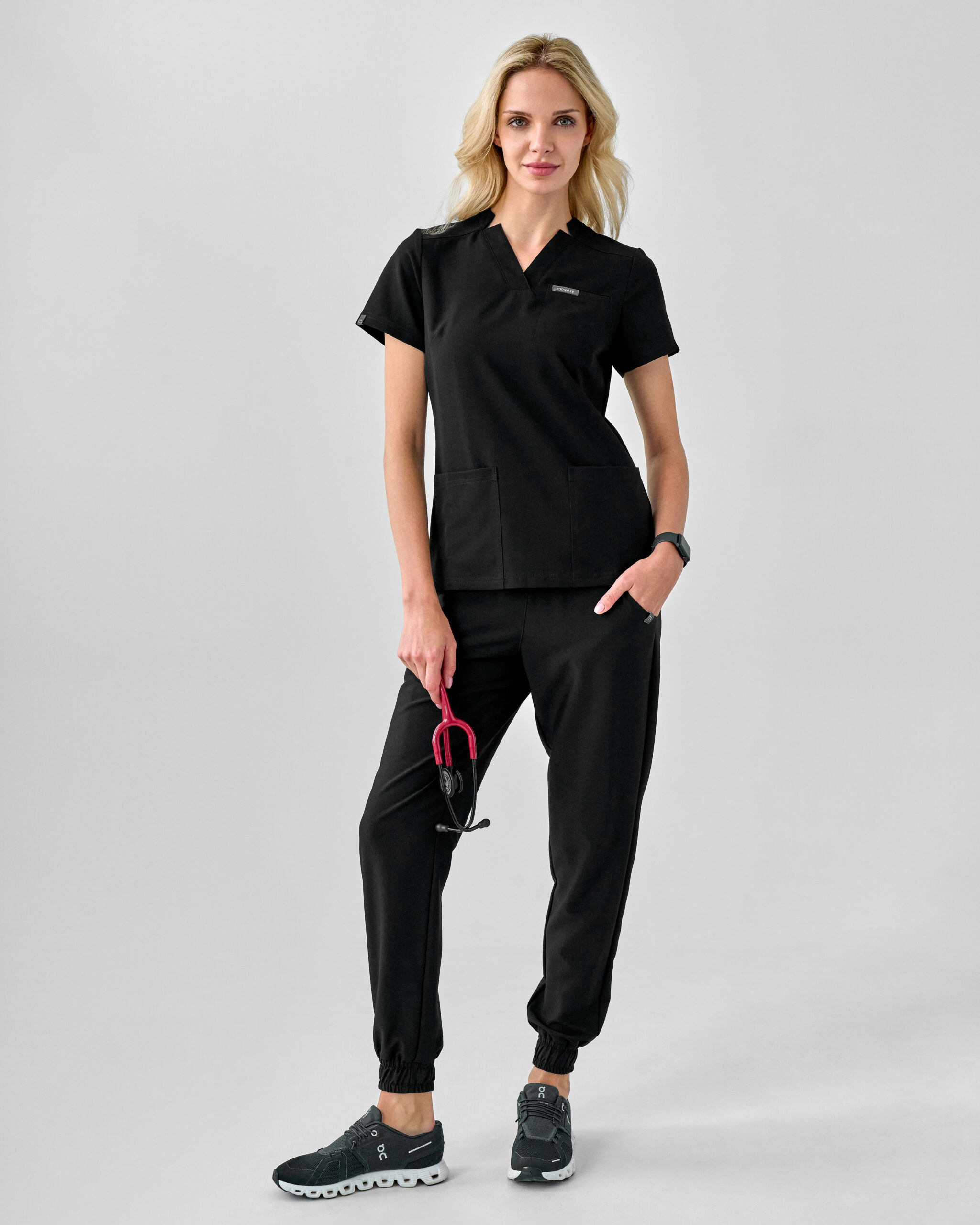 Zestaw je z bluzą medyczną comfy, basic, polo lub cozy, by stworzyć profesjonalny, czarny total look moodsy, który pracuje razem z Tobą – od początku do końca dnia. Dostępne są również w długości regular oraz petit (idealne dla osób poniżej 160cm).